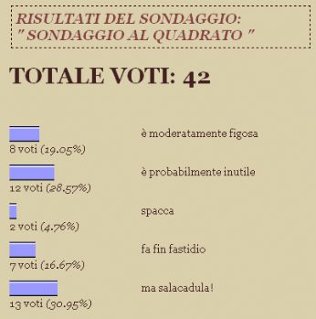 venerdì 16 giugno 2006 - ore 12:06 La bevanda degli dèi Si dichiari ufficialmente aperta lestate. LEGGI I COMMENTI (1) - PERMALINK mercoledì 14 giugno 2006 - ore 11:02 Cose che, con difficoltà, ho imparato a accettare [9] Se qualcuno ti tratta da mona, fingi di esserlo sul serio. Non hai modo di uscirne, quindi tanto vale scegliere la strada più economica. LEGGI I COMMENTI (7) - PERMALINK lunedì 12 giugno 2006 - ore 11:21 Gli improbabili dialoghi con Galvan Unamica: In effetti mi sto chiedendo quante cose mie tu abbia perdonato e non dimenticato... Galvan: Tutte. LEGGI I COMMENTI (4) - PERMALINK domenica 11 giugno 2006 - ore 12:05 Cazzo! Continuo a ricevere il "Cacao della domenica" di quella sagomaccia di Jacopo Fo, il quale, nonostante qualche cantonata clamorosa qua e là, continuna perlomeno a essere una delle poche persone che non ha paura di pensare autonomamente e di esprimere le proprie idee, per balzane e assurde che possano sembrare (o essere). Di recente ci ho letto una cosa che mi ha colpito parecchio. Penso che molti di voi abbiano sentito parlare di quello strano esperimento new age per determinare intolleranze o affinità verso alcune sostanze. Lidea è semplice. Si mette in mano al "paziente" una boccetta di vetro sigillata che contiene la sostanza incriminata; poi gli si chiede di premere pollice e indice dellaltra mano (o di fare qualcosa di analogo, tipo spingere contro un muro o simili) e si misura la pressione che viene esercitata. Il risultato sembra essere che, in presenza di sostanze "nocive" o comunque mal tollerate, il paziente riesce a esercitare una forza clamorosamente minore che in presenza di sostanze "buone". Jacopo Fo, con il quale ho scoperto di condividere un grosso scetticismo per questo fenomeno, ha voluto tentare di riprodurlo. Con un certo stupore, ha constatato che funzionava esattamente come descritto. Non pago, e ancora un po scettico, ha provato a realizzarlo "in cieco": le boccette venivano incartate in modo identico e poi numerate in modo che solo lo sperimentatore (non il paziente, quindi) potesse riconoscerle. Con stupore ancora crescente, ha constatato che anche in questo modo si misurava quasi sempre unapprezzabile diminuzione della forza muscolare. Piutosto scioccato da questo risultato, ha voluto comunque fare un ultimo tentativo: incartare ancora le boccette in modo da renderle irriconoscibili, ma renderle indistinguibili anche allo sperimentatore (il cosiddetto "doppio cieco"). Ebbene, improvvisamente non sono più state misurate variazioni della forza muscolare. In qualche modo, insomma, pur senza apparenti comunicazioni consce, lo sperimentatore era in grado di "dire" al paziente che cosa (secondo lui) gli faceva male. Non è il primo esperimento psicologico di questo tipo del quale sento parlare. Credo che possa essere una buona strada per prendere in considerazione tutta una serie di questioni, dallomeopatia a tecniche apparentemente soprannaturali di comunicazione extra-sensoriale, alle quali la ragione e la scienza sembrano ribellarsi. In fondo, sappiamo da tempo che leffetto placebo esiste: si tratta di sondare le capacità della mente e dellemotività umane, che sono indubbiamente maggiori di quel che ne sappiamo. Se riuscissimo a controllare e a indirizzare questo immenso potenziale, penso che riusciremmo a migliorare in modo impressionante la nostra vita e quella di tutte le persone che ci circondano. Buona giornata a tutti. LEGGI I COMMENTI (6) - PERMALINK sabato 10 giugno 2006 - ore 02:47 American Dreamz Cospettone! Convintissimo di andare a vedere una minchiata qualsiasi, tipo la classica americanata yeah yeah dove un po’ si sghignazza e un po’ ci si ovalizzano i maroni, mi sono invece scoperto di fronte a un film decisamente apprezzabile. In più di un’occasione mi ha pure fatto girare le palle, detto però come un complimento. Il finale è decisamente da stretta allo stomaco. Merita ampiamente i soldi del biglietto. P.S.: ma se no me ne sborasse gnente de averghe el me segno xodiacal sul blog, se podaria magari farghe calcossa, sì? LEGGI I COMMENTI (6) - PERMALINK venerdì 9 giugno 2006 - ore 18:25 Madonna, quant’è vero! (sexies decies) Dio disprezza la ricchezza: si capisce dal tipo di persone a cui sceglie di darla. (Anonimo) LEGGI I COMMENTI (4) - PERMALINK giovedì 8 giugno 2006 - ore 11:34 Basta sondaggio! Dichiario che il sondaggio al quadrato, ossia sondaggio sui sondaggi, è ufficialmente concluso. Ciò accade per due importantissime ragioni: la prima è che ha raggiunto il numero perfetto di votanti, come dimostra l’apposita sottografia (che si chiama così perché è qui sotto). ![]() La seconda ragione è che, dopo settimane di avvincente testa a testa, finalmente l’opzione per la quale spudoratamente parteggiavo ("ma salacadula!") si è staccata, sia pure di una sola incollatura. Faccio notare che, peraltro, la schiacciante maggioranza dei frequentatori votanti di questo blog sembra essere meno che tiepida nei confronti dei sondaggi. Ai tredici indifferenti ( 30.95% ) si accostano infatti ben diciannove contrari pari al 45.24% del totale: ciò rende i dieci favorevoli ( 23.81% ) uno sparuto gruppo di radi nuotatori nel vasto gorgo. Si può quindi ragionevolmente prevedere che questo blog non ospiterà altri sondaggi, a meno di questioni eccezionali che richiederanno un provvedimento altrettanto eccezionale. Ovviamente, la valutazione sull’eccezionalità avverra rigorosamente ad meum culum traentem. Buona giornata a tutti. LEGGI I COMMENTI (2) - PERMALINK mercoledì 7 giugno 2006 - ore 16:33 GiudiZZi e pignoni Giusto per dimostrare ancora una volta che lasciare perdere è una cosa della quale sono incapace, aggiungo un paio di righe alla diatriba tra giudizi e opinioni. Non so da quale vocabolario sia stata tratta la definizione riportata da Zilvio e dalla Donky (ma sospetto che sia lo Zingarelli, nei confronti del quale -- nel caso -- non potrei che ribadire la mia perplessità). In ogni