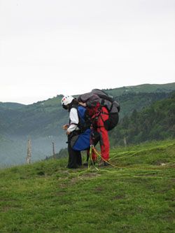 Arriva il mio turno e si decide di provare un lancio un pò diverso, da un punto molto più alto. Saliamo in 6 nella mia povera auto (più due vele che ingombrano tanto quanto una persona) e ci portiamo a 1600 metri o poco più. Il paesaggio lascia senza fiato!! Tra le roccie delle dolomiti più a nord, prati verdissimi e nubi che tolgono completamente la visuale della pianura sottostante, rimaniamo a bocca aperta. Io mi sarei dovuto lanciare da lì...