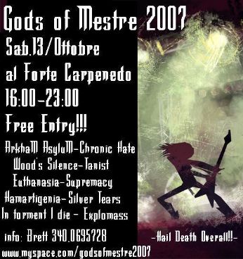 mercoledì 10 ottobre 2007 - ore 11:28 Ancora un aggiornamento Ecco qua, fresca fresca, la scaletta definitiva (si spera): 22:15-22.45 ARKHAM ASYLUM 21.30-22.00 CHRONIC HATE 20.45-21:15 TANIST 20:00-20.30 WOODS SILENCE 19.15-19.45 EUTHANASIA 18.30-19:00 SUPREMACY 17.45-18.15 HAMARTIGENIA 17.10-17.30 SILVER TEARS 16.35-16.55 IN TORMENT I DIE 16.00-16.20 EXPLOMASS 15.20-15:45 2009 LIVES LEGGI I COMMENTI (8) - PERMALINK domenica 7 ottobre 2007 - ore 11:05 Forse questa è la volta buona... Sembra che questa sia la versione definitiva di sta ca**o di locandina... COMMENTA (0 commenti presenti) - PERMALINK giovedì 4 ottobre 2007 - ore 14:54 Aggiornamento Gods Of Mestre ![]() Per ulteriori informazioni guardatevi il link che c’è scritto qua sopra, trovate anche il genere di ogni gruppo LEGGI I COMMENTI (7) - PERMALINK martedì 2 ottobre 2007 - ore 13:52 Come back Ebbene sì, dopo tutto sto tempo rieccomi qua, immagino che sarò mancato a tutti qua dentro.... Comunque, ci sono diverse novità: adesso vedo tutto in modo diverso ; non sono più un uomo Laif is nau; e soprattutto...![]() ![]() A breve (spero) ulteriori informazioni LEGGI I COMMENTI (12) - PERMALINK sabato 8 settembre 2007 - ore 22:52 Lavoro - 2 Ancora 8 minuti e poi per stasera ho finito!! LEGGI I COMMENTI (5) - PERMALINK mercoledì 29 agosto 2007 - ore 13:54 Lavoro Ecco, mi hanno prolungato il contratto di altre 2 settimane, il che mi va anche bene perchè al momento ho bisogno del vil denaro... però cheppalle, è proprio un lavoro di m***a! LEGGI I COMMENTI (6) - PERMALINK giovedì 9 agosto 2007 - ore 19:42 Lo sfigato sfiga [Enciclopedie - Enciclopedia generale] sfiga sf. [sec. XX; s-+figa, variante sett. di fica]. Nel gergo giovanile, sfortuna, scalogna, iella Ma si può??? Dopo più di un anno in cui lo sfigato in questione è stato praticamente sempre disoccupato, arriva l’estate, arriva agosto, arriva il momento di andare in ferie (meta stabilita: Praga, data prevista di partenza: 20 agosto, suppergiù); il suddetto sfigato comincia i preparativi per le vacanze, fa anche le prove con la tenda, quand’ecco che riceve la telefonata che gli illumina la giornata: "Lunedì 13 agosto cominci a lavorare!" Insomma, morale della favola: vacanze saltate! Povera compagna di viaggio dello sfigato..... LEGGI I COMMENTI (4) - PERMALINK sabato 4 agosto 2007 - ore 18:04 Tanto per scrivere qualcosa... (questo BLOG è stato visitato 2222 volte) ULTIMI 10 VISITATORI: ospite, *sabry*, ospite, petaurus, Mrsick, ospite, Mad Maiden, LEYLA, ospite, ospite COMMENTA (0 commenti presenti) - PERMALINK venerdì 13 luglio 2007 - ore 16:27 Day after... COMMENTA (0 commenti presenti) - PERMALINK domenica 8 luglio 2007 - ore 14:48 Nanowar - The number of the Bitch Geniali!! Attenzione al testo!! LEGGI I COMMENTI (2) - PERMALINK > > > MESSAGGI PRECEDENTI |