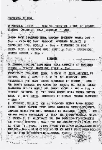 FONOGRAMMA N.1059 da COMANDO STAZIONE CARABINIERI DI MESSINA at MINISTERO INTERNO - SERVIZIO PROTEZIONE CIVILE. Stop. Identificato finalmente SISMA. Stop. Trattasi di SISMA GIUSEPPE FU GAETANO nato a Napoli il 6/4/1945 et qui residente. Stop. Noto pregiudicato per reati contro patrimonio et persona. Stop. Per quanto riguarda EPICENTRO non risulta nel nostro elenco anagrafico né in quello dei comuni vicini. Stop. Potrebbe trattarsi, se cè stato errore nella vostra battitura telegrafica, di BEPI CENTRO, conosciuto et stimato maestro elementare. Stop. Il movimento tellurico non ha provocato alcun danno perché questa locale caserma tiene sotto controllo tutti i movimenti, compresi quelli politici, sindacali e religiosi. Stop. Non abbiamo potuto controllare la scala del Sig. MERCALLI perché lo stesso si è allontanato dal suo domicilio et sconoscesi suo attuale recapito. Stop. Per noi Carabinieri i gradi sono gli stessi di prima: io sono appuntato et mio collega Carabiniere semplice. Stop. Ora però dobbiamo andare perché qui cè stato un terremoto della madonna. Stop"