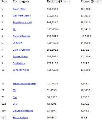 Ciao a tutti, sono tornato. In mancanza di spunti degni di nota, per tenermi allenato, vi posto una notizia che ho appreso oggi durante la lezione di Economia ed organizzazione aziendale. Il rispettabile sito www.fortune.com ha pubblicato la classifica delle 500 società con i più grandi fatturati del 2006. Qui sotto ho riportato le prime 10 posizioni e quelle delle ’poche’ imprese italiane presenti in questa particolare classifica..