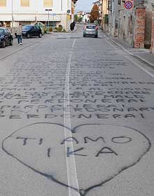 Un ragazzo di Cussignacco (Udine) la notte di Natale ha trascritto per la strada del suo paese lintero testo della canzone di Antonello Venditti "Dalla pelle al cuore". Quando al mattino la fidanzata è uscita di casa si è trovata 30 metri di dichiarazione... conclusa con un "ti amo ika" = ti amo federica. Ragione del gesto, un tradimento da farsi perdonare. Le cronache rassicurano che lobiettivo è stato raggiunto... Lei si è levata il broncio e lha perdonato. Sembra una favola. Con una degna conclusione tipo: "E tutti vissero felici e contenti".