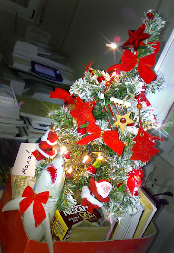 Oggi ho comunque fatto il microalbero da scrivania... che va sempre ben. Ho messo un fiocchetto anche a Flipper... Che guarda minaccioso i Babbozzi Natali. Mah...