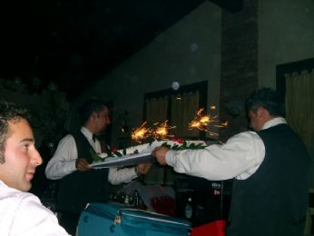 DOPO UNABBONDANTE CENA: PICCOLO INTRATTENIMENTO CON OLIVE ASCOLANE, PATATINE, VERDURE PASTELLATE; CESTINO DI PASTASFOGLIA CON RICOTTA E SPINACI ACCOMPAGNATO DA RUCOLA SFILACCI DI CAVALLO E GRANA,RISOTTO DI FUNGHI, TAGLIOLINI AI BRUSCANDOLI (CREDO), ARROSTO DI NON SO COSA,SORBETTO... ECCO IL DOLCE