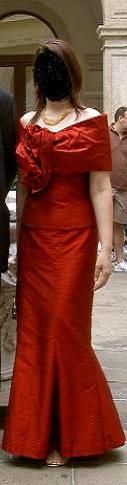 ...arriva in esclusiva una mia foto di sabato scorso (per Moki che voleva vedere il vestito), ma con la faccia rigorosamente oscurata (meglio che incollarci sopra il viso di Berlusconi). La cerimonia è stata commovente e la festa veramente bella, nonostante i miei plurimi contrattempi che sempre mi tiro dietro: sandali rotti argh! rimanendo incastrati tra i sanpietrini del centro storico; sono perfino riuscita a perdermi a Padova nel tentativo di raggiungere il ristorante... Ora gli sposi se la spassano a zonzo tra i fiordi del Mar Baltico (beati loro) e tutti gli ospiti sono ripartiti, mentre qua è tornata la normalità con un pizzico di nostalgia. Ah, ora rimango l’unica della mia famiglia non sposata e mia mamma comincia già a lanciarmi frecciatine. Aiutooooo!!!!!!