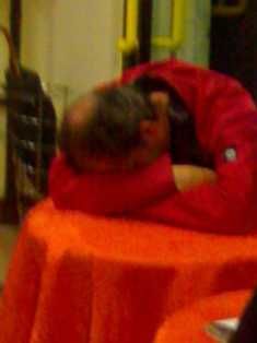 Mi ha fatto ridere: un uomo siede solo a un tavolo…china la testa….e con un numero mai visto riesce ad incartarsi fra sedia, tavolo, tovaglia e copri-tovaglia in un’unica entità…