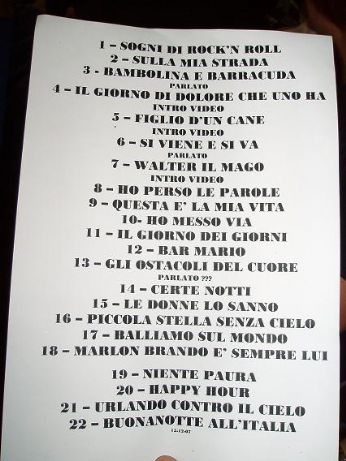giovedì 3 gennaio 2008 - ore 16:45 Capodanno ’08 Quel dì del 29 dicembre la compagnia alcolica e il Gnaro’s group (senza purtroppo alcuni elementi) partirono x una vacanzina di 5 giorni in quel di Termeno (BZ)... Poi visitarono anche Bolzano... Non una, non 2, non 3, bensì ...4 VOLTE siorre e siorri! Ancora Termeno e il suo splendido paesaggio... ....Qui è stato commesso un delitto... Signora Fleccer aiutaci tu! ![]() I fuochi di San Silvestro Pattinaggio (senza lame) sul lago di Caldaro... La splendida Merano LEGGI I COMMENTI (5) - PERMALINK giovedì 27 dicembre 2007 - ore 14:55 Ti direi che non mi importa Che tu possa stare male Ti direi che ti ho tradito Che ho succhiato altro sangue Ti direi che non ho voglia Di ascoltare i tuoi problemi Non mi importa se tu vivi A Londra Tokyo New york Ti direi che non mi frega un cazzo Delle tue paure Ho già le mie che urlano più forte, più forte Solo una cosa Io sto male Non voglio più stare con me Non voglio più dipingere quel che non c’è Non voglio più leggere scrivere e dire Che lei non mi toccherà più Non mi basta distruggere A me non mi basta lanciare quest’ultimo grido Quest’ultimo gemito Mi toccherò e morirò solo per lei Ti direi che non rispetto Le tue grandi confessioni Ti direi che non intendo Misurare le parole Voglio scavare un solco profondo Tra me e te Tra me e te Voglio che mi odi con tutte le tue forze Non voglio ricordare Non voglio cose da ricordare Perché fa male SYRIA - Mi consumi Vento silenzio e la voglia di evadere scalare montagne per poi saltare giù ed immergersi nel mare profondo afferrarti riportarti su salvarci dal tempo e rincorrere un mondo che sarà nostro stringimi più forte che puoi amore credo all’eccezione che siamo Mi consumi mi consumi c’è una parte di me che si annulla perchè mi consumi mi consumi sei la mia energia non riesco ad odiarti mai mi consumi mi consumi Ore distanze grandi sogni da vivere i miei anni presenti tutti dentro un grande vaso che sto riempiendo strati di pensieri che sento dentro credo all’eccezione che siamo mi consumi mi consumi ho bisogno di te per capire anche me mi consumi mi consumi io mi nutro di te e non smetterei mai mi consumi mi consumi Crescerò con te volerò per te inseguendo la verità voglio crederci non svegliarmi più invisibili io e te Mi consumi mi consumi c’è una parte di me che si annulla perchè mi consumi mi consumi sei la mia energia non riesco ad odiarti mai mi consumi mi consumi LEGGI I COMMENTI (3) - PERMALINK lunedì 24 dicembre 2007 - ore 15:28 ![]() Buon Natale a tutti quelli che passeranno di qui LEGGI I COMMENTI (7) - PERMALINK domenica 23 dicembre 2007 - ore 15:32 Venerdì 21.12. ore 20:30 è nata la mia nuova cuginetta!! 3,450 kg ![]() LEGGI I COMMENTI (3) - PERMALINK giovedì 20 dicembre 2007 - ore 21:13 yeah YEAH LEGGI I COMMENTI (4) - PERMALINK mercoledì 19 dicembre 2007 - ore 18:24 ...andate a guardare il nuovo blog in collaborazione con Ligabue88: BarMarioCh COMMENTA (0 commenti presenti) - PERMALINK mercoledì 19 dicembre 2007 - ore 00:38 Messaggio SMS Ich brauche WAS zu heulen. Bestimmt allein ein paar Augenblicke zu bleiben, vielleicht rennen, vielleicht stehen. Wahrscheinlich etwas (jemanden) beißen. Ja. Jemanden beißen. Und auf ihn treten. Aber das ist nur Rauch. Nun lege ich. Und warte (darauf). Traduzione x i non germanofili: AAAAAARRRRGGGHHHHH!!!!!!! LEGGI I COMMENTI (6) - PERMALINK martedì 18 dicembre 2007 - ore 15:41 LEGGI I COMMENTI (3) - PERMALINK domenica 16 dicembre 2007 - ore 19:12 Si prega di non far regali di Natale perchè io non ne farò. Grazie ![]() ![]() ![]() Vi farò gli auguri a tempo debito LEGGI I COMMENTI (5) - PERMALINK domenica 16 dicembre 2007 - ore 17:42 15.12.2007 - DatchForum di Assago (MI) FINALMENTE IL TANTO ATTESO CONCERTO DI LUCIANO ![]() ![]() ![]() Eravamo piazzati proprio davanti al mixer in centro e a un passo dalla passerella da dove se ne è uscito lui ![]() Walter il mago... Ho perso le parole... Per Ligabue88: ho fatto quello che ho potuto spero si veda abbastanza bene perchè io ho il monitor kaputt ![]() Esibizione con Piccola stella senza cielo... Scaletta molto bella secondo me, azzeccatissimi i passaggi da una canzone allaltra e in buona posizione le 2 canzoni nuove, anche se - diciamocelo - son quello che sono.... Comunque super concertone, ne è valsa la pena aspettare 5 ore fuori al freddo!! E.... alla prossimaaaaaaaaaa LEGGI I COMMENTI (13) - PERMALINK > > > MESSAGGI PRECEDENTI |