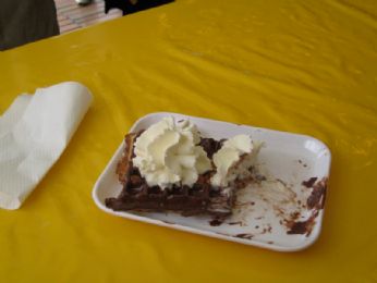 la colazione a base di colesterolo fatta alla festa con della pasta fritta inbevuta nel ciocolato fuso e con la panna montata sopra, una delizia.