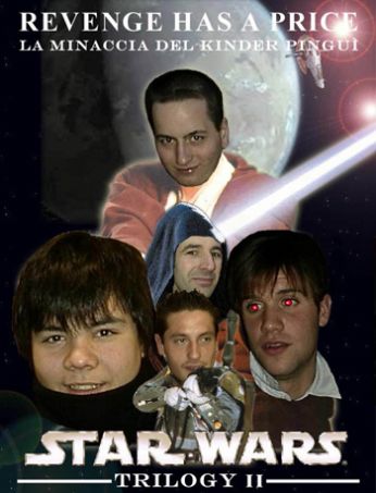 Qui si pubblicizza la seconda trilogia: "La Minaccia del Kinder Pinguì"..