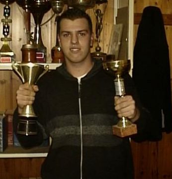 Mirko (il "Bobby Aratro" de "Il Padrino") impugna orgoglioso due coppe della bacheca del patronato..