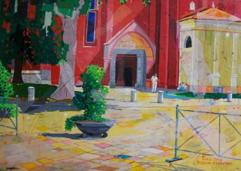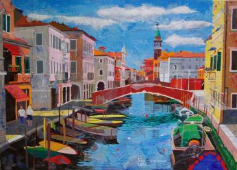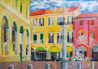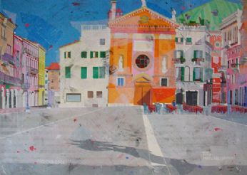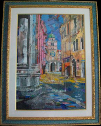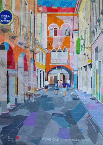 Una Padova Allegra e viva quella che ci propone Valentino Brugnotto nelle sue opere: monumenti storici vecchi di secoli prendono nuova vita sotto le sue abili mani, con un tocco preciso per la prospettiva, con sapienti accostamenti di colori sempre vivaci, mai retorico ma sempre attento a risvegliare l’occhio distratto dell’osservatore. E così dal suo pennello rinascono luoghi famosi oppure recondite vie del centro città, dimenticate ormai dai più, con gli immancabili pedoni, ricchi di particolari, il tutto condito con un sapiente accostamento cromatico. Un’innovativa e positiva visione del quotidiano, come se per Valentino Brugnotto non esistessero mai giorni grigi. Mario Benincà ![]() Per contatti: quadri.tino@hotmail.it