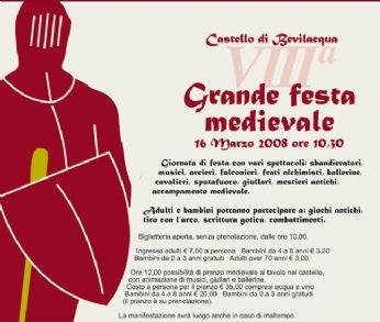 Udite udite, popolo di Sprissopoli. Nel dì del lo 16 di marzo vi sarà una grande festa medievale a lo Castello di Bevilacqua. Musici, sbandieratori, falconieri, saltimbanchi, sputafuoco, giullari, cavalieri et uomini d’arme saranno livi ad acogliervi e a farvi vivere aventure d’un altro tempo.