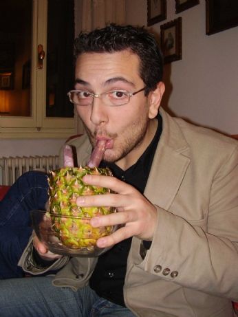 Il mio uomo e il suo ananas. Mi ha lasciata per ore abbandonata sul divano per rimpinguare questo ananas di vodka, pezzi d’ananas e latte condensato. Un beverone ripugnante, ma l’amore è cieco - e neanche con gli altri 4 sensi se la cava bene.