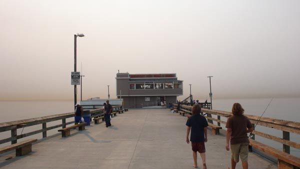 il pontile di newport beach, il cielo è grigio perchè gli incendi hanno creato na schifezza di fumo