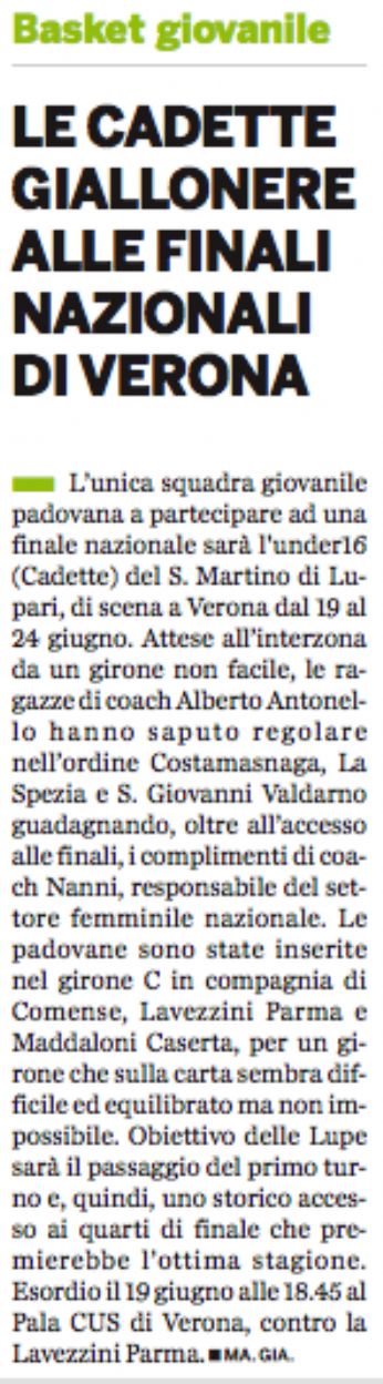 Cadette. Alter Ego terzo in Italia (g.pell.) Storica impresa per il basket padovano giovanile, e in particolare femminile, da parte delle cadette under 16 (nate 1990) dellAlter Ego San Martino di Lupari che si sono classificate terze alle finali nazionali disputate nei giorni scorsi a Verona. Per la società del presidente Francesco Cordiano si è trattata della terza partecipazione consecutiva ad una finale. La formazione allenata da Alberto Antonello dopo aver chiuso al secondo posto il proprio girone battendo Parma nella gara desordio (81-60), venendo sconfitta da Como (69-53) ed aggiudicandosi la gara decisiva contro Caserta (65-56), nei quarti di finale ha avuto la meglio per 63-47 sulla "corazzata" Reyer Venezia campione dItalia in carica da due anni ed imbattuta fino a quel momento in questa stagione (tra laltro, vantando 4-0 negli scontri diretti). Giunte in semifinale, le "lupette" si sono arrese per un solo punto, 63-62, al Casalecchio di Reno ma rifacendosi poi, sempre di un punto, nella finale di consolazione contro Udine, vinta per 51-50.
