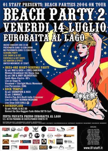 Giardino Estivo Baita al Lago a Castelfranco Veneto (TV). Come l’anno scorso BEACH PARTY organizzato dalla discoteca VINILE. Cosa è successo: 2700 persone, mia festa di laurea con special guest mio fratello Guera, anche se non ci conoscevamo ancora. E’ stato bello saperlo tanti mesi dopo. Ma soprattutto quella è stata la volta in cui ho visto l’alba abbracciato alla tavoletta del water. Cosa accadrà: sinceramente non lo so. Il programma prevede tre situazioni musicali, una rock con SoundPark + 3Maniacs + Dj del Vinile, una Elettronica con ospite Andy dei Bluvertigo ed una terza di revival italiano. Tra le varie cose Herman Medrano live, percussionisti vari, le Sick Girls che non ho capito se cantano, si spogliano o fanno entrambe le cose, giocolieri e mangiafuoco, alcool a go go (provate l’Ice Canyon se ne avete coraggio), varie ed eventuali. Tutto bellissimo. Se piove state a casa, festa rinviata al venerdi dopo. Noi saremo a Benicassim. Maramao.