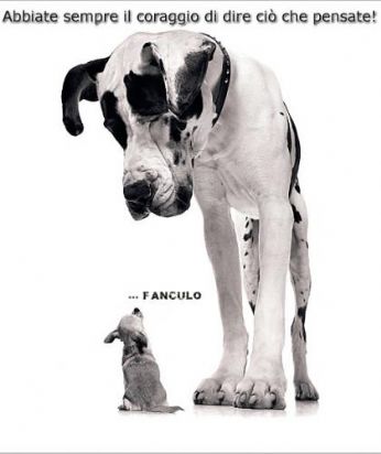 martedì 4 marzo 2008 - ore 15:01 con questa giornata di temporale sapete di che avrei voglia di qst: ![]() + ![]() + COMMENTA (0 commenti presenti) - PERMALINK lunedì 3 marzo 2008 - ore 17:24 scusate i termini ma oggi è proprio una giornata di.... ![]() ...MERDA.. e chissà se tra 1 mese o anche meno mi troverò a cercare lavoro perchè sarò disocuppata o per merito mio o per decisioni superiori..mah..vedremo PS: io ho 21 anni NO 40 come da immagine COMMENTA (0 commenti presenti) - PERMALINK venerdì 29 febbraio 2008 - ore 14:46 NON CI POSSO CREDERE ![]() finalmente è VENERDI e ne ho le palle veramente piene di qst settimana ![]() un super GRAZIE a chi in ufficio mi ha sopportato e mi ha perdonato dopo tnt parole un po al vento e solo perchè sono un po troppo sotto col lavoro.. COMMENTA (0 commenti presenti) - PERMALINK giovedì 28 febbraio 2008 - ore 14:45 ![]() LO AMMAZZO QUEL BRUTTO BAMBINO CRESCIUTO VIZIATO... FANCULOOOOO COMMENTA (0 commenti presenti) - PERMALINK giovedì 28 febbraio 2008 - ore 08:26 COMMENTA (0 commenti presenti) - PERMALINK mercoledì 27 febbraio 2008 - ore 11:24 Dimostrarlo con il cuore, la testa, le mani". E che cos’è l’amore? "Credo ci siano diversi tipi di amore. Quello per una donna, quello per i figli, quello per gli amici. Ho scoperto che molte persone hanno paura di amare, hanno paura di vivere l’amore. Perché in amore devi dare, devi essere altruista. Forse è più facile non amare. Siamo spesso prigionieri del nostro egoismo". Parole di Cesare Prandelli COMMENTA (0 commenti presenti) - PERMALINK martedì 26 febbraio 2008 - ore 08:22 1900 che sono stati bambini e che adesso hanno 16-17-18-19 anni o più... Nel periodo in cui si poteva fare tutto... vi ricordate? Adesso i tempi sono cambiati... e i bambini non sono più quelli del nostro periodo... Noi che... Dedicato a chi c’era... Noi che... ci divertivamo anche facendo ’Strega tocca colore’. Noi che... facevamo ’Palla Avvelenata’. Noi che... giocavamo regolare a ’Ruba Bandiera’. Noi che... non mancava neanche ’dire fare baciare lettera testamento’. Noi che... i pattini avevano 4 ruote e si allungavano quando il piede cresceva. Noi che... quando giocavamo col Lego facevamo anche castelli alti 6 piani che nn si smontavano mai. Noi che... chi andava in bici senza mani era il più figo. Noi che... anche quelli che impennavano però non se la tiravano poco. Noi che... si urlava ’chi vuole giocare a nascondino?’ e bisognava mettere il dito sotto la mano dell’amico altrimenti ’si sta per chiudereeee!!’. Noi che... suonavamo al campanello per chiedere se c’era l’amico in casa. Noi che... facevamo a gara a chi masticava più big babol contemporaneamente. Noi che... avevamo adottato gatti e cani randagi che non ci hanno mai attaccato nessuna malattia mortale, anche se dopo averli accarezzati ci mettevamo le dita in bocca. Noi che... i termometri li rompevamo, e le palline di mercurio giravano per tutta casa. Noi che... dopo la prima partita c’era la rivincita, e poi la bella, e poi la bella della bella. Noi che... giocavamo a ’Indovina Chi?’ anche se conoscevi tutti i personaggi a memoria. Noi che... sul pullman della gita giocavamo a ’fiori frutta e città’ (e la città con la D era sempre Domodossola). Noi che... con 100 lire ti prendevi una cicca con le 3 figurine dei calciatori. Noi che... ci mancavano sempre quattro figurine per finire pure l’album Panini. Noi che... ce l’ho ce l’ho...MANCA. Noi che... le cassette della Disney le abbiamo viste così tante volte che ora a distanza di 15 anni sappiamo ancora cosa cantavano Robin Hood e Little John. Noi che... in TV guardavamo solo i cartoni animati. Noi che... avevamo i cartoni animati belli!!! Noi che... litigavamo su chi fosse più forte tra le tartarughe ninja. Noi che... abbiamo raccontato 1500 volte la barzelletta del fantasma formaggino. Noi che... cercavamo di far sorridere i sofficini ma si rompevano sempre in 2. Noi che... non avevamo il cellulare per andare a parlare in privato sul terrazzo. Noi che... i messaggini li scrivevamo su dei pezzetti di carta da passare al compagno. Noi che... si andava in cabina alla fine della scuola per prendere le schede finite. Noi che... c’era la macchina fotografica usa e getta e facevi fino a 20 foto. Noi che... non era Natale se alla tv non vedevamo la pubblicità della Coca Cola o della Bauli con l’albero. Noi che... le palline di natale erano di vetro e si rompevano. Noi che... se guardavamo tutto il film delle 20:30 eravamo andati a dormire tardissimo. Noi che... guardavamo film dell’orrore anche se avevi paura. Noi che... giocavamo a calcio durante l’intervallo col tappino della bottiglia. Noi che... suonavamo ai campanelli e poi scappavamo. Noi che... nelle foto delle gite facevamo le corna ed eravamo sempre sorridenti. Noi che... il bagno si poteva fare solo dopo 2 ore che avevi finito di mangiare. Noi che... a scuola andavamo con cartelle da 2 quintali e senza rotelle. Noi che... quando a scuola c’era l’ora di ginnastica partivamo da casa in tuta e con le scarpette nello zaino. Noi che... se a scuola la maestra ti metteva una nota sul diario, a casa era il terrore. Noi che... le ricerche le facevamo in biblioteca, mica su Google. Noi che... internet non esisteva. Noi che... la merenda a scuola te la portavi da casa. Noi che... si poteva star fuori in bici il pomeriggio. Noi che... se andavi in strada non era così pericoloso. Noi che... però sapevamo che erano le 4 perché stava per iniziare BIM BUM BAM. Noi che... il primo novembre era ’Tutti i Santi’, mica Halloween. Che fortuna esserci stati... LEGGI I COMMENTI (3) - PERMALINK venerdì 22 febbraio 2008 - ore 12:11 Ciò un po di traffico nellanima , non ho capito che ora è ciò il frigo vuoto, ma voglio parlare perciò, paghi te. Che tu sia un angelo od un diavolo, ho 3 domande per te : chi prende linter, dove mi porti e poi dì, soprattutto perché? Perché ci dovrà essere u