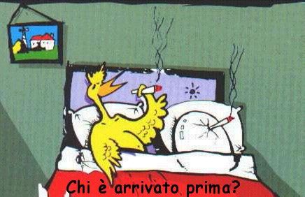 "Ze indubiamente nata prima la galina, parché se fusse nato prima l’ovo del galinaceo el gavarìa sielto n’altro posto dal quale esso vegnere fora!"
